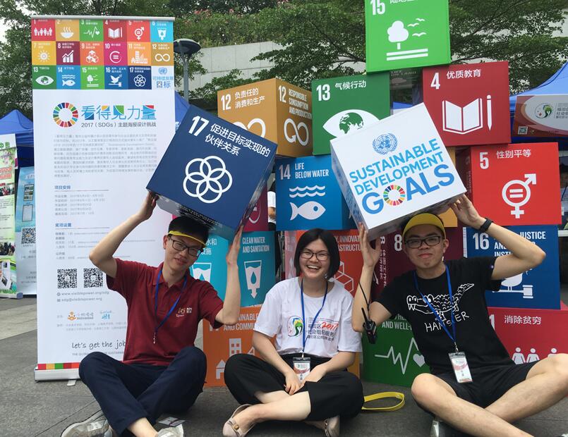 5月14日,在深圳书城广场举办的第三届福田社会服务周展示现场,「看得见力量」青年公益传播计划“2017(SDGs)主题海报设计挑战”项目第一次在线下与公众见面,18个方形的目标展示方块成为公众了解SDG的直接表达,通过互动游戏,引导公众在了解SDG的同时参与到主题海报的项目中... ...